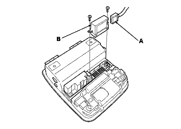 1. Remove the roof console, Service and Repair and disconnect the connector (A) from the HFL-navigation microphone (B).
