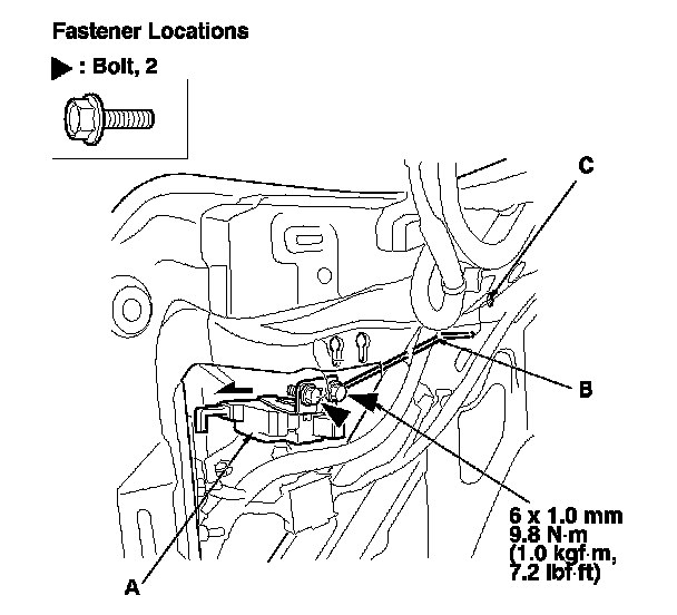 3. Loosen the bolts. Remove the fuel fill door actuator (A) by sliding it upward, and remove the rod (B) from the grommet (C).
