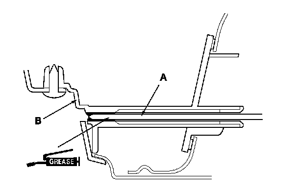 - Apply multipurpose grease to the rod (A) where it slides inside the grommet (B).