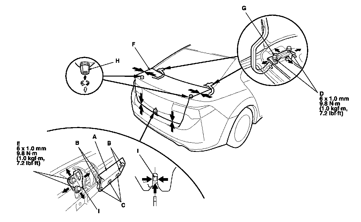 4. Adjust the trunk lid (F) alignment in the following sequence: