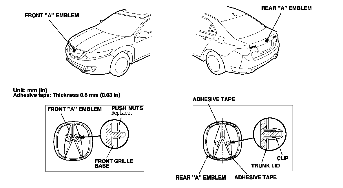 - ACURA and TSX emblems: Remove the adhesive backing. Put the emblem with the application guide foam on the trunk lid as shown, then press the emblem into place, then remove the film and the application guide foam.
