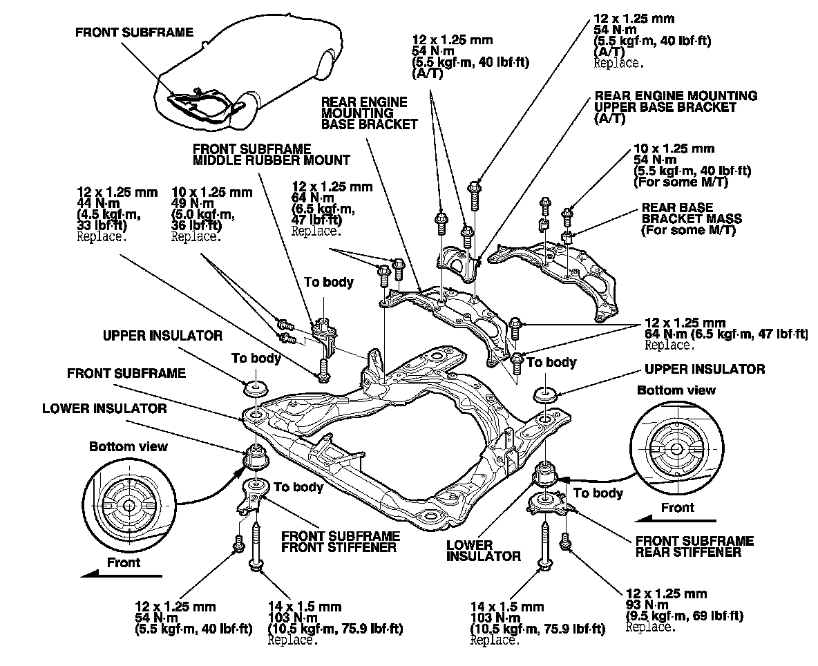 After removing the front subframe mounting bolts, the front subframe middle rubber mount mounting bolts, the front subframe rear stiffener mounting bolts, the rear engine mounting base bracket mounting bolts, and the rear engine mounting upper base bracket mounting bolt be sure to replace them with new ones.
