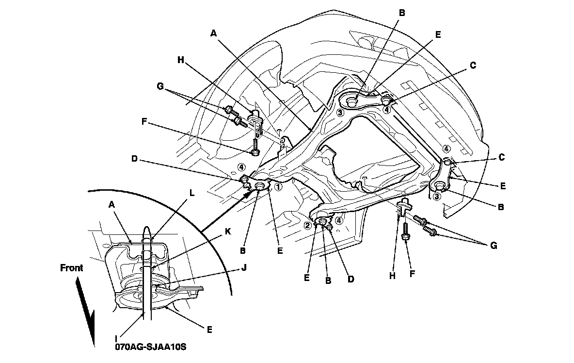 Loosely install the new subframe middle mounting bolts (F, G) securing the subframe middle mounts (H).