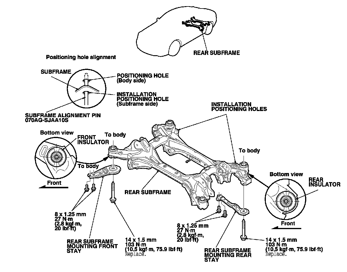 -5 Tighten the subframe mounting bolts to the specified torque values starting with the right rear subframe mounting bolt. Use the subframe alignment pin when tightening the rear side subframe mounting bolts.