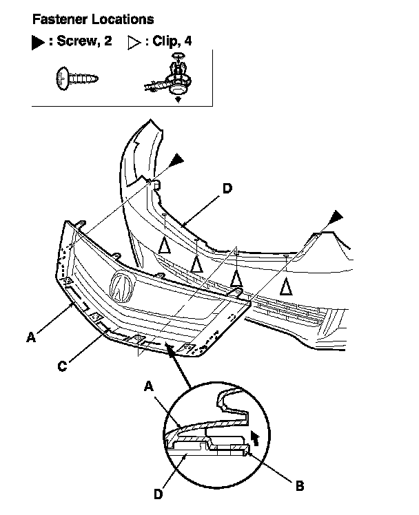 Release the hooks (B) and the ribs (C) from the front bumper (D).