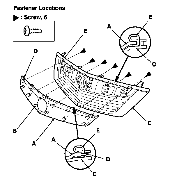 Release the hooks (B) (six places) with a flat-tip screwdriver from the front grille base (C).