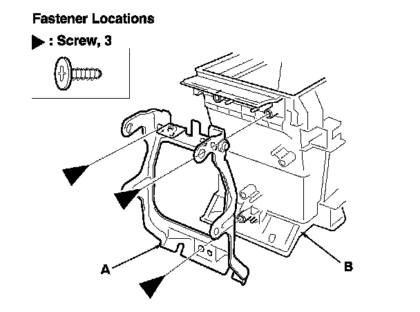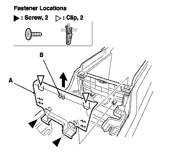 2. Remove the screws. Pull up the center trim (A) to detach the clips and to release the hook (B), then remove the trim.