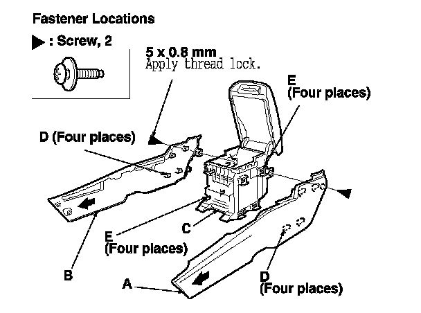 3. Remove the screws securing the driver's side panel (A) and the passenger's side panel (B) from the console box (C). Slide the driver's side panel and the passenger's side panel forward to release the ribs (D) of the panels from the hooks (E), then remove the side panels.