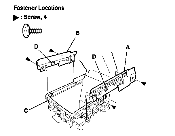 4. Remove the screws. Remove the left box rail (A) and the right box rail (B) by pulling them up from the console box (C) while releasing the hooks (D).