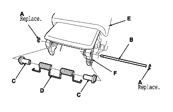 7. Remove the E-clips (A), the hinge pin (B), the hinge bushings (C), and the opening spring (D) from the console armrest (E) and the console box (F).