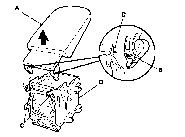 8. Open the console armrest (A), and while releasing the gear areas (B) of both sides from the dampers (C) of the console box (D), remove the armrest.