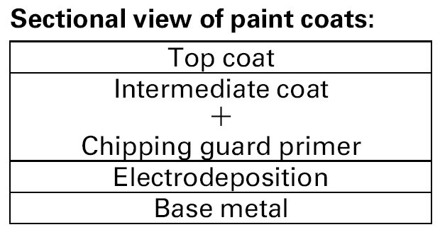 The removal of paint and undercoating by stone chips immediately exposes metal to the atmosphere, causing it to oxidize. The thickness of this oxidation increases if the process continues unchecked. The soft chipping guard primer protects against damage due to the impact of such objects.