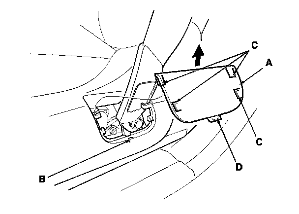 2. Slide the front seat all the way forward. Carefully pry up on the bottom of the anchor cover (A) at the pry point (B) with the appropriate trim tool to release the hooks (C) and the tab (D), then remove the cover by pulling it upward.