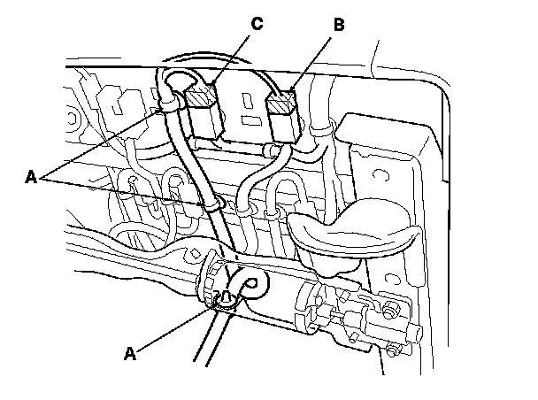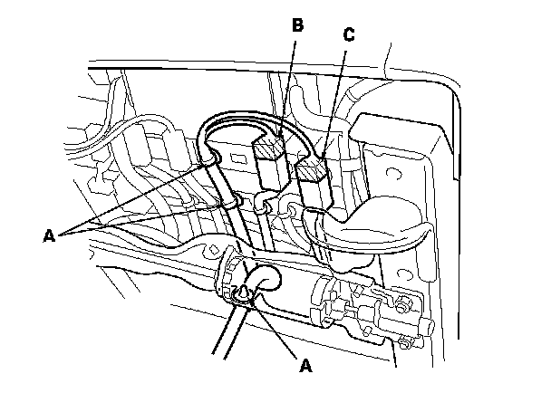 8. Lift up the front seat, then detach the harness clips (A). Disconnect the side airbag connector (B) and the seat wire harness connector (C). On the passenger's seat, disconnect the ODS unit harness connector (D).