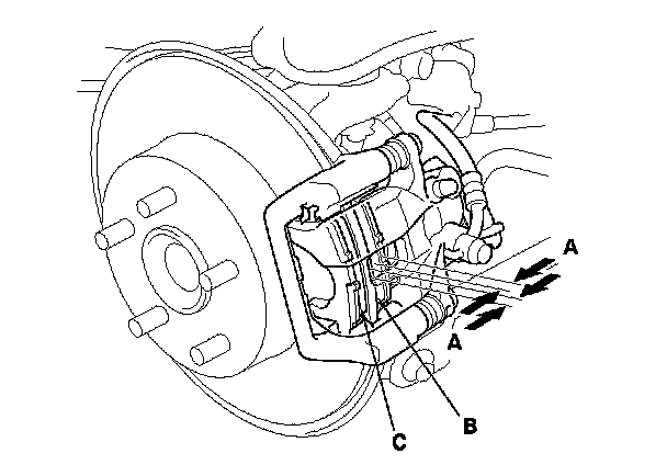 Verify that the caliper pins (C) move in and out smoothly. Clean and lube if needed.