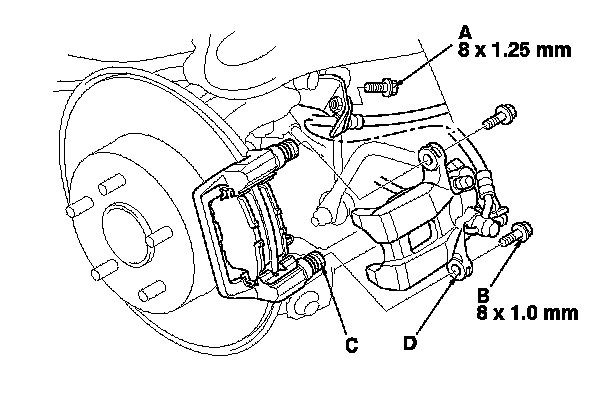 5. Remove the flange bolts (B) while holding respective caliper pin (C) with a wrench. Be careful not to damage the pin boot, and remove the caliper (D). Check the hose, the pin boots, and the parking brake cable boots for damage and deterioration.