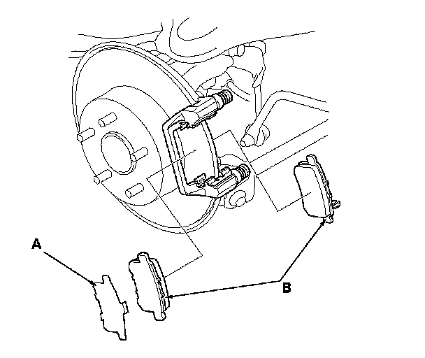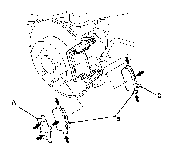 3. Check the thickness (A) of the inner pad (B) and the outer pad (C). Do not include the thickness of the backing plate.