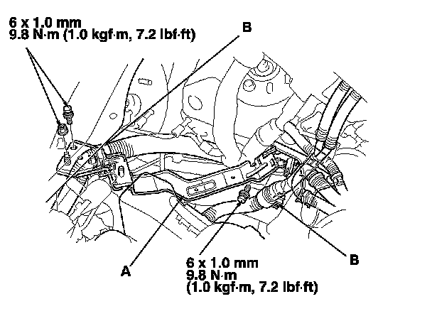 5. Remove the under-hood fuse/relay box bracket (A), then remove the engine wire harness clamps (B).