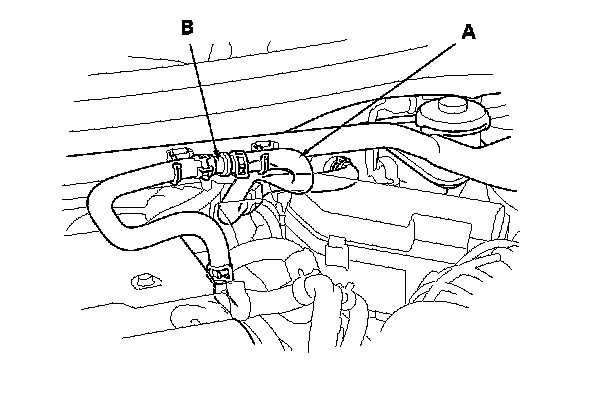 3. Disconnect the brake booster vacuum hose (A) at the booster. The check valve (B) is built into the hose.