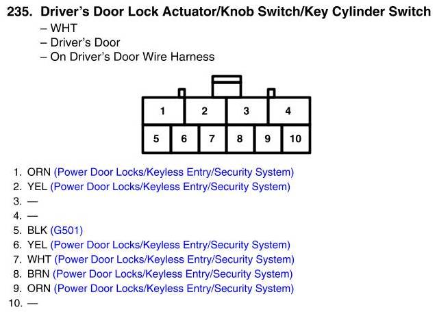 View 235 - Driver's Door Lock Actuator/Knob Switch/Key Cylinder Switch Connector View