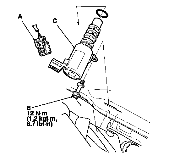 2. Remove the bolt (B) and the VTC oil control solenoid valve (C).