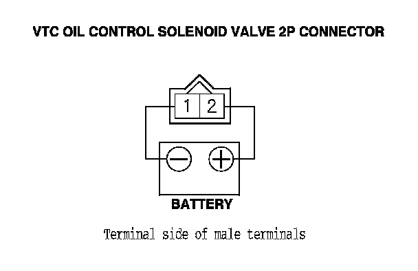 3. Connect VTC oil control solenoid valve 2P connector terminal No. 2 to the battery positive terminal with a jumper wire. Connect VTC oil control solenoid valve 2P connector terminal No. 1 to the battery negative terminal with a jumper wire.