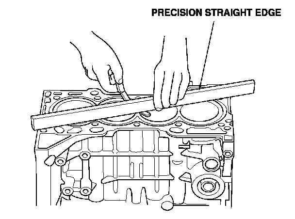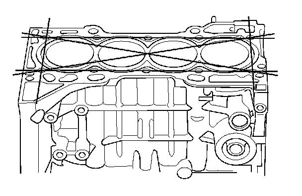 6. Check the top of the engine block for warpage. Measure along the edges and across the center as shown.