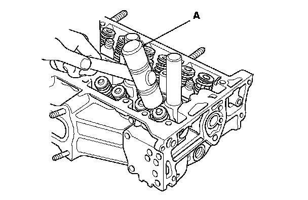 8. Lightly tap the end of each valve stem two or three times with a plastic mallet (A) to ensure proper seating of the valve and the valve cotters. Tap the valve stem only along its axis so you do not bend the stem.