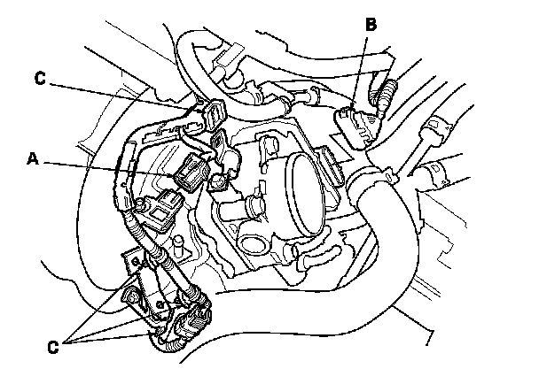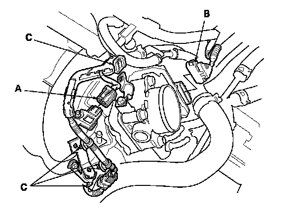 5. Disconnect the manifold absolute pressure (MAP) sensor connector (A) and the throttle actuator connector (B), then remove the wire harness clamps (C).