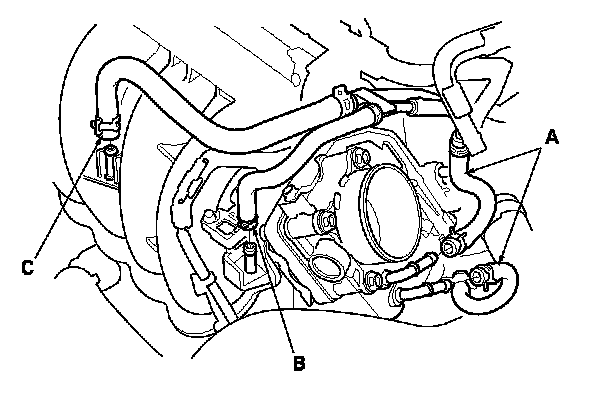 8. Connect the EVAP canister hose (B) and the brake booster vacuum hose (C).