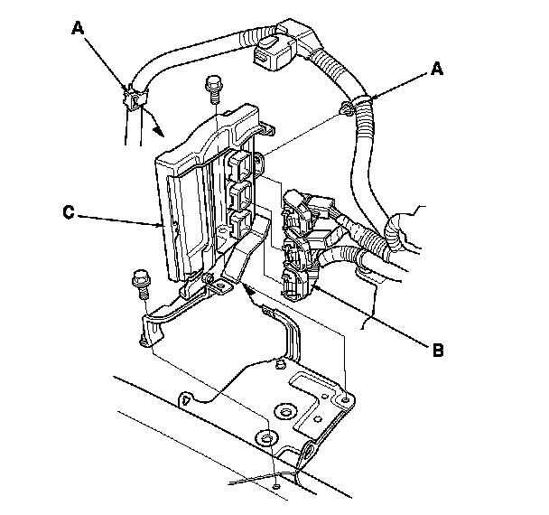 7. Disconnect the engine control module (ECM)/powertrain control module (PCM) connectors (B).