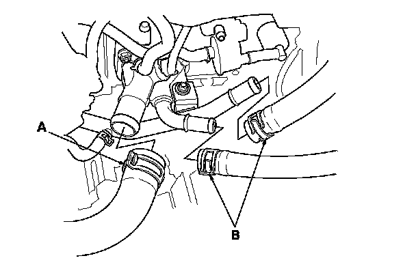34. Disconnect the upper radiator hose (A) and the heater hoses (B).