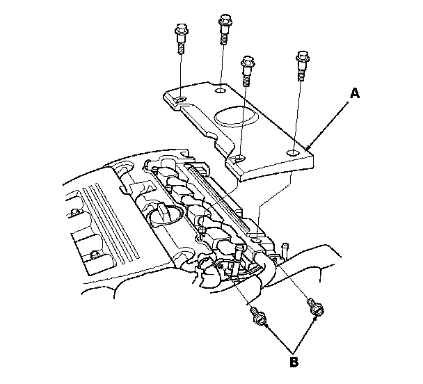 36. Remove the ignition coil cover (A) and the brake booster vacuum line mounting bolts (B).