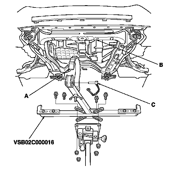 49. Attach the front subframe adapter (VSB02C000016) to the subframe by hanging the belt (A) over the front of the subframe (B), then secure the belt with its stop (C).