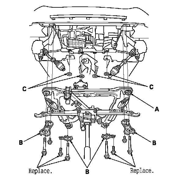 51. Remove the front subframe (A), the stiffeners (B), and the steering gearbox washers (C).