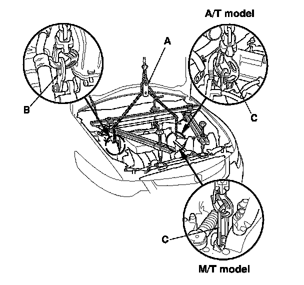 55. Attach a chain hoist (A) to the universal lifting eyelet (B), and the transmission hook (C), then lift the engine/ transmission until it is securely supported by the chain hoist, and remove the engine support hanger.
