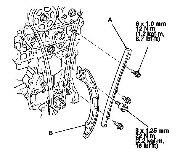 1. Set the crankshaft to top dead center (TDC). Align the TDC mark (A) on the crankshaft sprocket with the pointer (B) on the engine block.