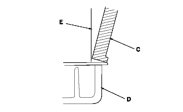 19. Install the spacer (A), then install the new O-ring (B) on the chain case. Set the edge of the chain case (C) to the edge of the oil pan (D), then install the chain case on the engine block (E). Wipe off the excess liquid gasket on the oil pan and chain case mating area.