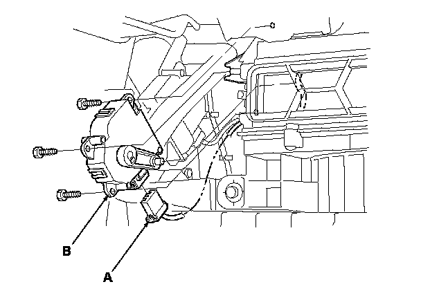 2. Disconnect the 7P connector (A) from the recirculation control motor (B). Remove the self-tapping screws and the recirculation control motor from the blower unit.