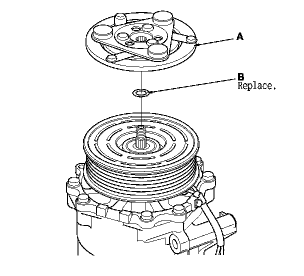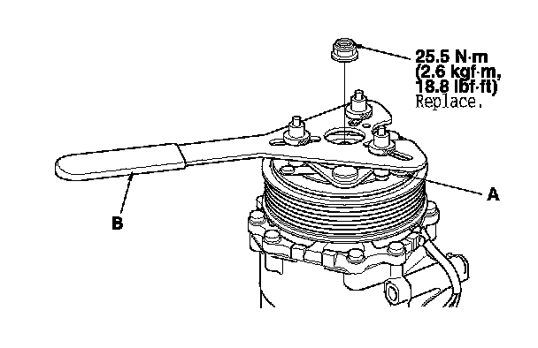 1. Remove the center nut while holding the armature plate (A) with a commercially available A/C clutch holder (B).