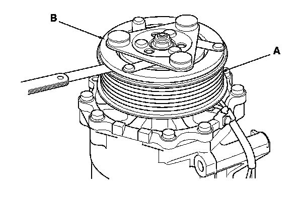 3. Measure the clearance between the rotor pulley (A) and the armature plate (B) all the way around. If the clearance is not within specified limits, remove the armature plate Service and Repair and add or remove shims as needed to increase or decrease clearance.