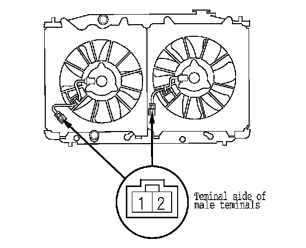 1. Disconnect the 2P connectors from the radiator fan motor and the A/C condenser fan motor.