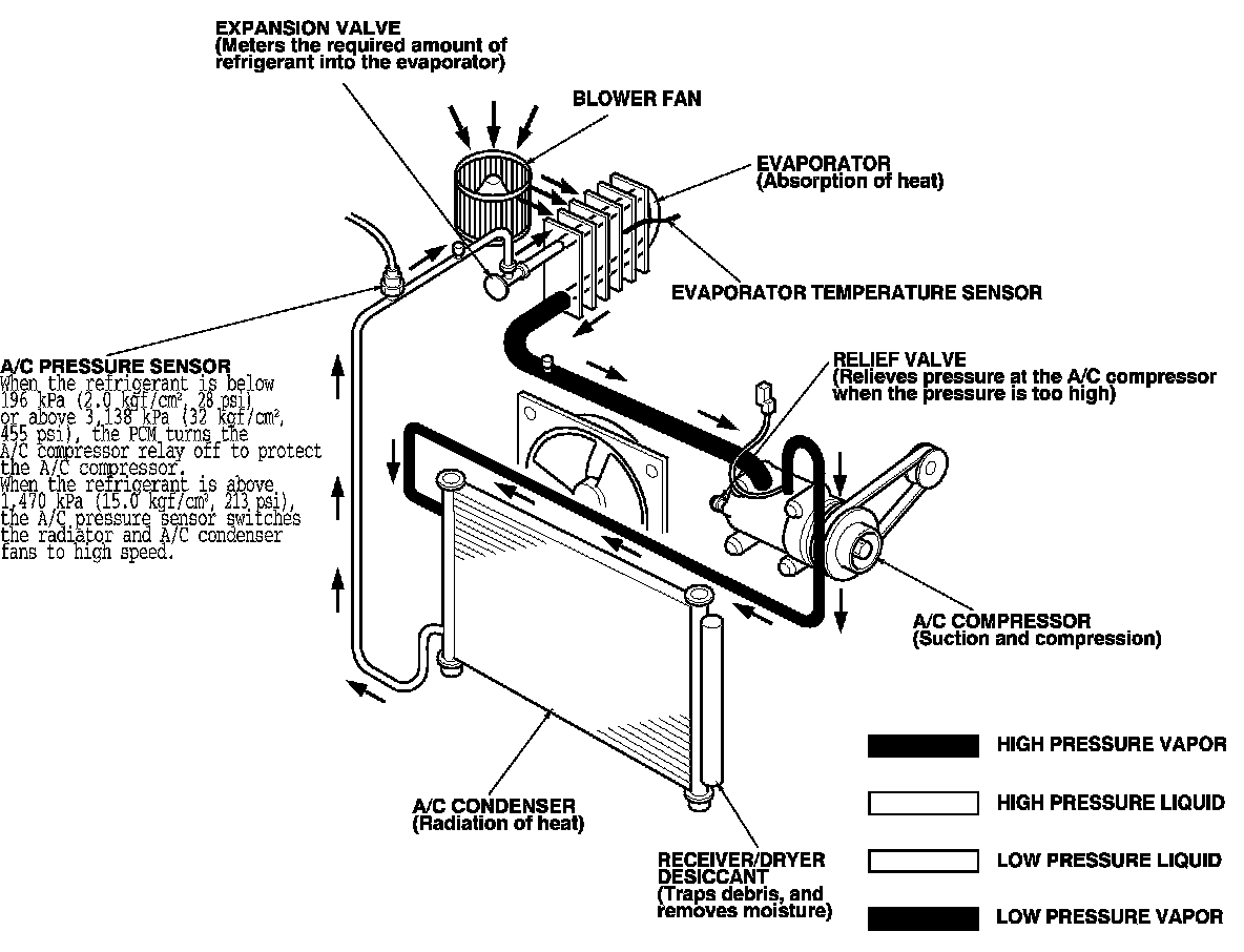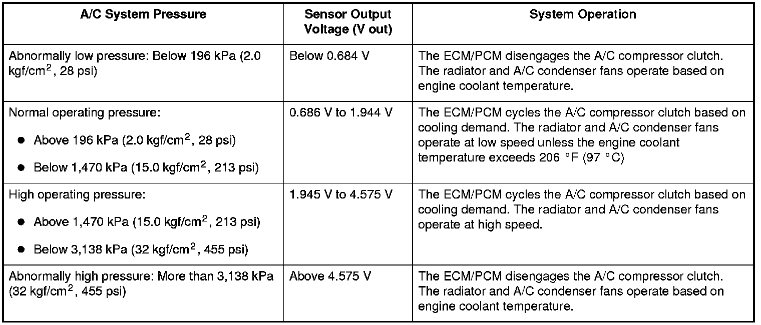 NOTE: When the refrigerant is below 196 kPa (2.0 kgf/cm2, 28 psi) or above 3,138 kPa (32 kgf/cm2, 455 psi), the ECM/PCM turns the A/C compressor relay off to protect the A/C compressor. When the refrigerant pressure is above 1,470 kPa (15.0 kgf/cm2, 213 psi), the ECM/PCM switches the radiator and A/C condenser fans to high speed.