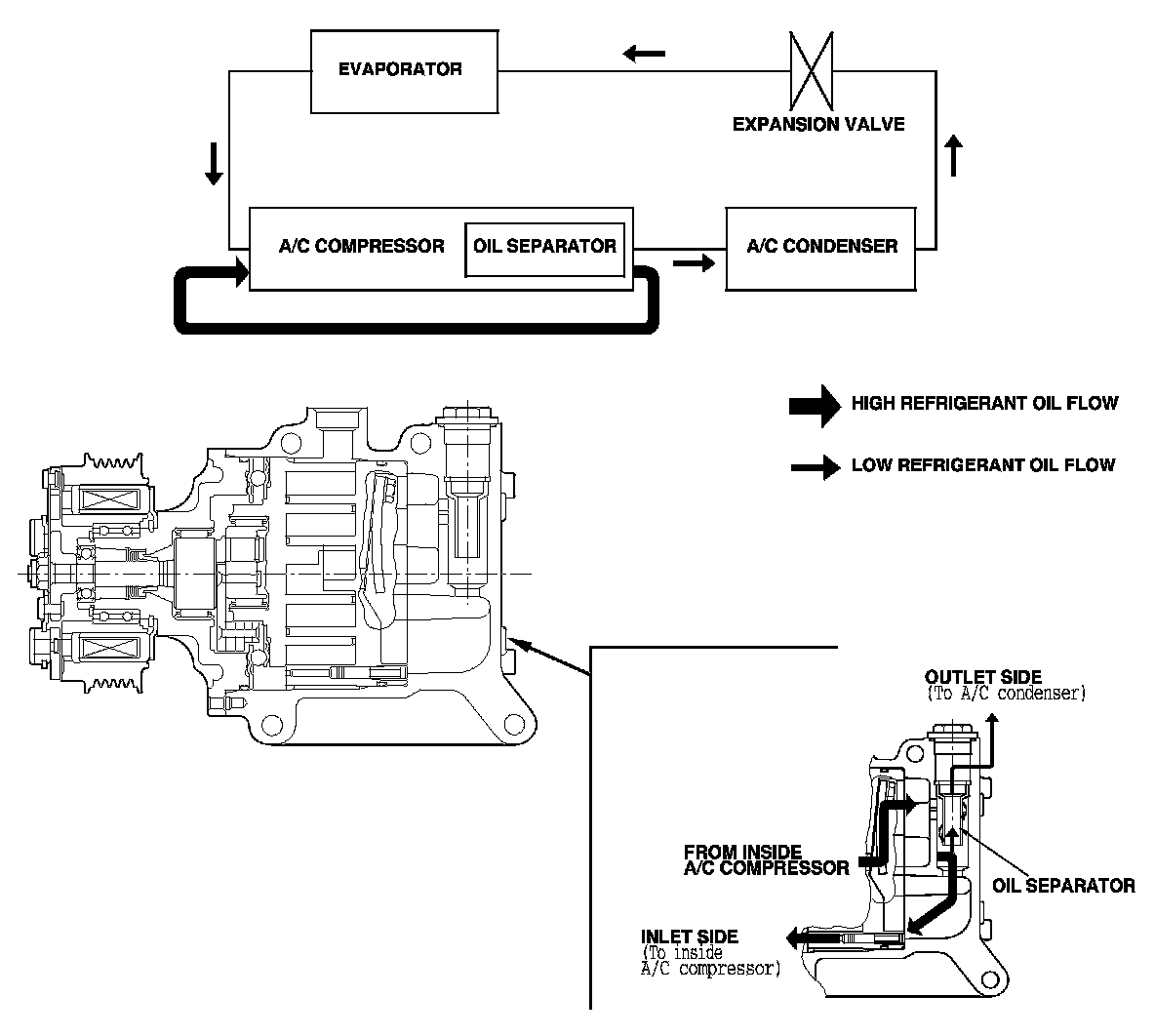 Oil emission from the A/C compressor to the A/C line is reduced by placing the oil separator in the A/C compressor. This results in a thinner oil film inside of the heat exchanger (A/C condenser and evaporator). Air conditioning efficiency is increased without sacrificing engine performance.