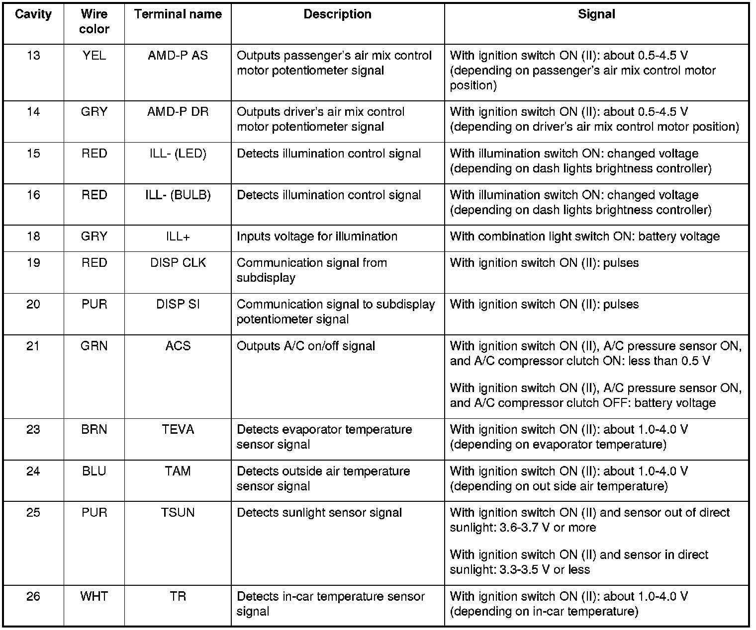 This system automatically controls the temperature and the vent mode of the air direction to the driver and passenger's side depending on the angle of the sun and the direction of the vehicle. It calculates information such as date, time, longitude, and latitude from the navigation system, as well as the radiant strength of the sun from the sunlight sensor, to determine the appropriate mode position and temperature to be directed to each side.