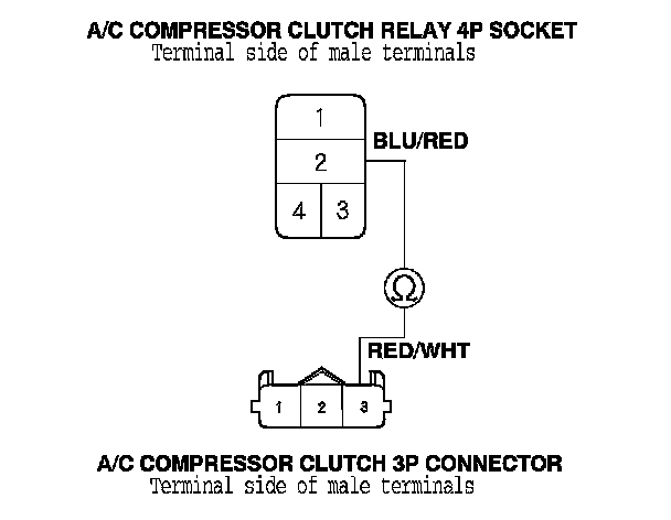 7. Remove the A/C compressor clutch relay from the under-hood fuse/relay box, and test it. Testing and Inspection