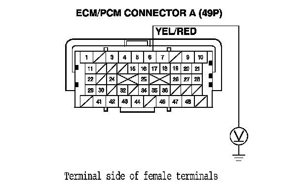 7. Measure the voltage between the ECM/PCM connector A (49P) terminal No. 6 and body ground.