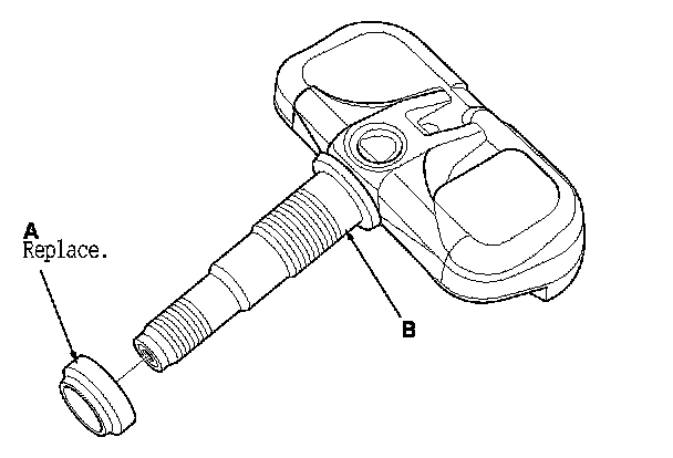 7. Remove and discard the valve stem grommet (A) from the tire pressure sensor (B).