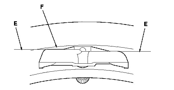NOTE: Install the tire pressure sensor so that the sensor housing surface (E) should not exceed the protrusion (F) of the wheel to prevent the sensor housing from being caught on the bead of the tire when assembling the tire. Be sure to always mount the tire pressure sensor with the feet (G) in the downward position toward the wheel.