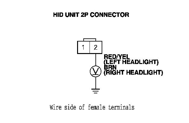 9. Measure the voltage between HID unit 2P connector terminal No. 2 and body ground.